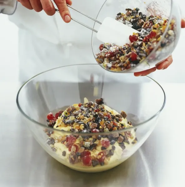 Soak cranberries and raisins, then drain. Mix them gently into the dough.